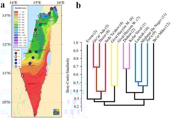 Study sites, their geographical locations and spider assemblage similarities. Sites are numbered on the map (Figure 1a) and in parentheses in Figure 1b. (a) Map of Israel rainfall, with the 12 pomegranate orchards (study sites) colored according to the four Bray–Curtis clusters shown in Figure 1b. (b) Cluster analysis based on Bray–Curtis similarity index of spider assemblages in the 12 sites. Sites that cluster together are shown on the map (a) as circles and in the dendrogram (b) as lines with colors: cluster A—red, B—yellow, C—pink, and D—blue. Two sites that are not clustered with any other sites are shown as white circles and black lines. The map of Figure 1a is adapted with permission from the Israel Metrological Services (IMS).