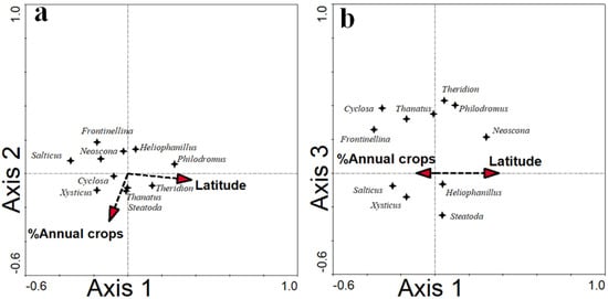 Ordination diagrams from the CCA analysis representing the spider genera that constitute 1% or more of the abundance data from 12 pomegranate orchards. (a) Biplot (genera–environment) ordination diagram of the first and second axes, and (b) biplot (genera–environment) ordination diagram of the first and third axes. The quantitative environmental variables are the latitude and the percent of surrounding annual crops and are marked with red arrows. Spider genera are marked with black stars.
