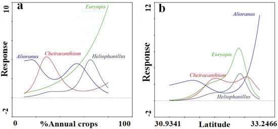 Response curves of the most abundant spider genera. Only significant relationships are presented and fitted using generalized additive models (GAM): (a) response curve for the percent of surrounding annual crops and (b) response curve for latitude.