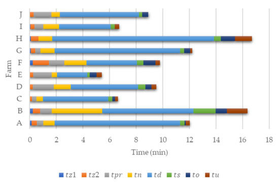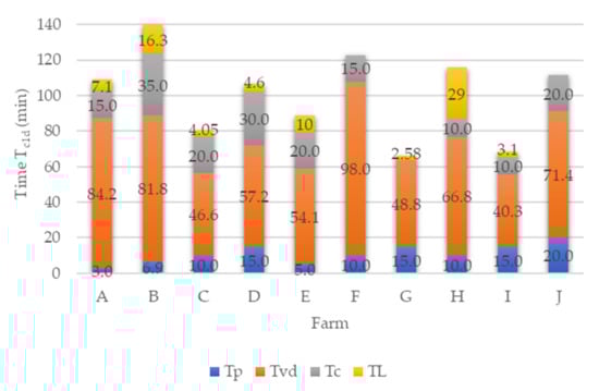 There is a significant unevenness on the farms in terms of time to prepare the Tp milking parlor, which is the shortest on farm A (3 min) and the longest on farm J (20 min), and in terms of time for final work activities after milking Tc is the shortest on farms H and I (10 min) and the longest on farms B (35 min) and D (30 min), which is reflected in the real time of single milking Tc1d (Table 3 and Figure 3). For farm G, the data regarding the time for final work activities after milking were not acquired.