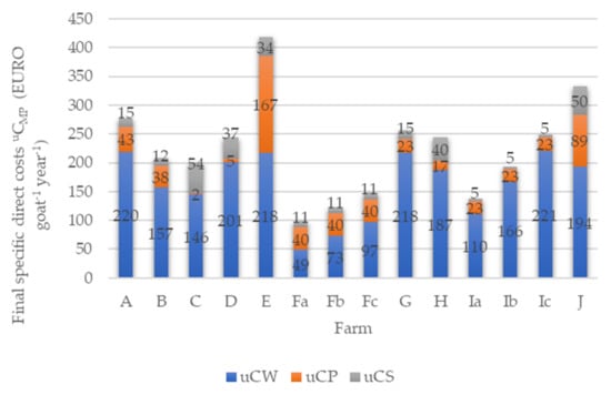 The highest specific costs of the milking parlor uCP 167 EUR goat−1 year−1 are calculated for farm E, with a herd of 110 lactating goats, and equipped with the most expensive parallel milking parlor with 12 + 12 stalls and swing-over milking unit.