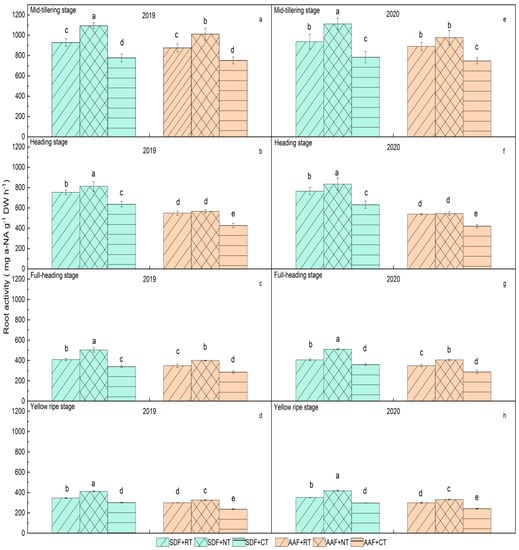 Root activity at different stages of rice under different tillage and fertilization treatments. (a–d) represent the root activity in mid-tillering stage, heading stage, full-heading stage and yellow ripe stage in 2019, respectively. (e–h) represent the root activity in mid-tillering stage, heading stage, full-heading stage, and yellow ripe stage in 2020, respectively. SDF + RT: Side Deep Fertilizing and Reduced Tillage. SDF + NT: Side Deep Fertilizing and No Tillage. SDF + CT: Side Deep Fertilizing and Conventional Tillage. AAF + RT: Artificially Applying Fertilizer and Reduced Tillage. AAF + NT: Artificially Applying Fertilizer and No Tillage. AAF + CT: Artificially Applying Fertilizer and Conventional Tillage. Different lowercase letters marked on the histogram mean significant differences among treatments at the 5% level according to Duncan’s multiple-range test (0.05) (similarly hereinafter).