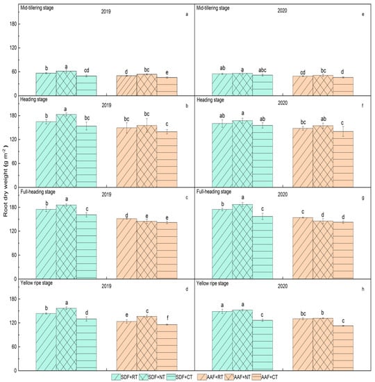 Root dry weight at different stages of rice under different tillage and fertilization treatments. (a–d) represent the root dry weight in mid-tillering stage, heading stage, and full-heading Scheme 2019, respectively. (e–h) represent the root dry weight in mid-tillering stage, heading stage, full-heading stage, and yellow ripe stage in 2020, respectively. Different lowercase letters marked on the histogram mean significant differences among treatments at the 5% level according to Duncan’s multiple-range test (0.05) (similarly hereinafter).
