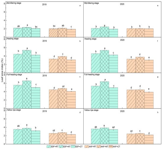Leaf area index (LAI) at different stages of rice under different tillage and fertilization treatments. (a–d) represent the leaf area index in mid-tillering stage, heading stage, full-heading stage, and yellow ripe stage in 2019, respectively. (e–h) represent the leaf area index in mid-tillering stage, heading stage, full-heading stage, and yellow ripe stage in 2020, respectively. Different lowercase letters marked on the histogram mean significant differences among treatments at the 5% level according to Duncan’s multiple-range test (0.05) (similarly hereinafter).