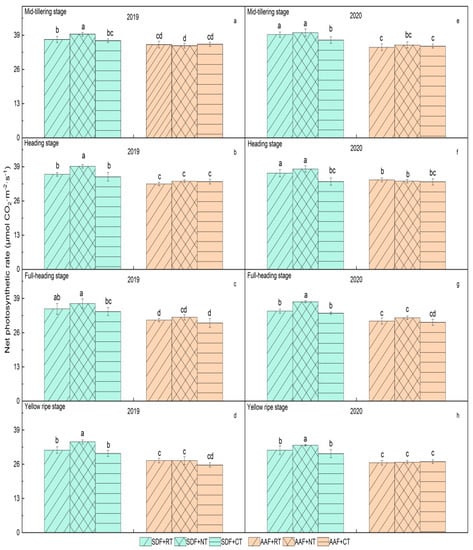 Net photosynthetic rate at different stages of rice under different tillage and fertilization treatments. (a–d) represent the net photosynthetic rate in mid-tillering stage, heading stage, full-heading stage, and yellow ripe stage in 2019, respectively. (e–h) represent the net photosynthetic rate in mid-tillering stage, heading stage, full-heading stage, and yellow ripe stage in 2020, respectively. Different lowercase letters marked on the histogram mean significant differences among treatments at the 5% level according to Duncan’s multiple-range test (0.05) (similarly hereinafter).