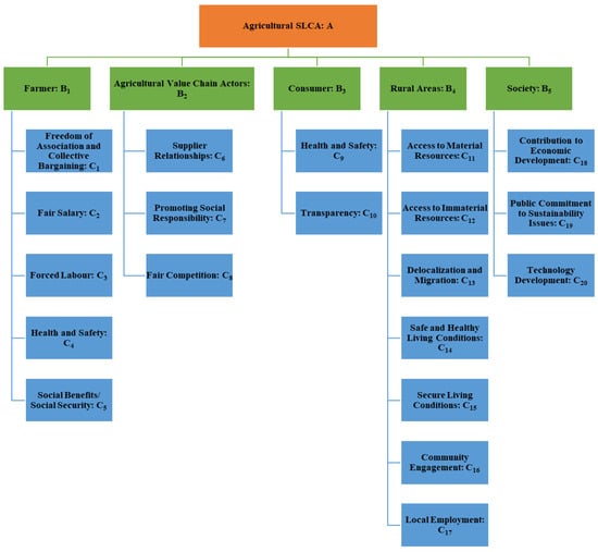 Analytic Hierarchy Process (AHP) is a multi-criteria decision-making method to help decision-makers facing a complex problem with multiple conflicting and subjective criteria [56]. Due to the different roles of stakeholder categories and subcategories in the agricultural life cycle, this study used AHP to determine factor weights, including four steps: