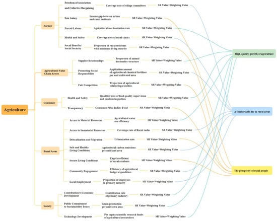 In order to construct the agricultural SLCA system, a literature review and bibliometric analysis were conducted. Firstly, the study analyzed the selection relevant articles for a literature portfolio [44,46,47,48,49]. Secondly, the Chinese “No. 1 central documents” from 2010 to 2020 were extracted by Python to confirm the key points of agriculture in China. Finally, the assessment indicators system from categories to subcategories was determined based on the above results, combined with SLCA Guidelines and the methodological sheets for subcategories in SLCA proposed by UNEP/SETAC [50]. At the same time, subcategories lacking data or having little or even no impact on Chinese agriculture were excluded. The detailed SLCA indicators from categories to subcategories within the system boundary are specified in Figure 1.