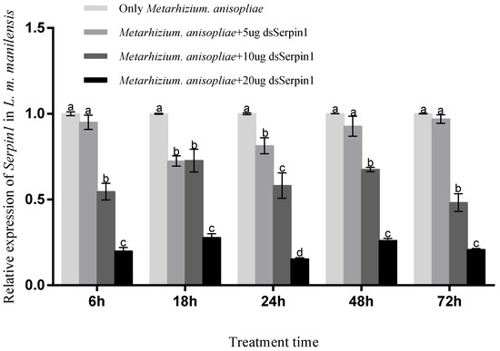 Relative expression of Serpin1 in L. m. manilensis showing the effect of feeding different dosages of dsSerpin1 with M. anisopliae at five points in time after treatment administration. (There were differences between a–d representatives and other groups).
