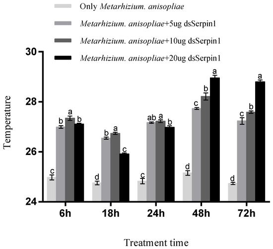 The average body surface temperature of L. m. manilensis with dsSerpin1 added into the diet and the addition of M. anisopliae only was significantly higher than the surface body temperature observed in L. m. manilensis (blank control, Figure 2). There was a significant increase in the temperature of L. m. manilensis after the administration of the RNAi treatments compared to when only M. anisopliae was administered at each measured treatment time (p < 0.05). The temperature of L. m. manilensis that had only been fed M. anisopliae was 24.95 ± 0.31 °C on average, and their temperature did not change much over time. Higher L. m. manilensis temperatures were strongly evident after the administration of the RNAi treatments after 6 h, and their temperatures peaked at 48 h. At 48 h, L. m. manilensis that had been fed with 5 μg, 10 μg, and 20 μg dsSerpin1 had mean temperatures of 27.73 ± 0.04 °C, 28.22 ± 0.14 °C, and 28.95 ± 0.11 °C, respectively. This high temperature was maintained until 72 h had passed. At 48 h and 72 h, the temperature increased with the increase in the dsSerpin1 dose, and there were significant differences among the different doses administered in the dsSerpin1 treatment groups.