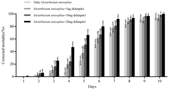 Corrected mortality of L. m. manilensis showing the effects of feeding different doses of dsSerpin1 with M. anisopliae for up to 10 days. (There were differences between a–c representatives and other groups).