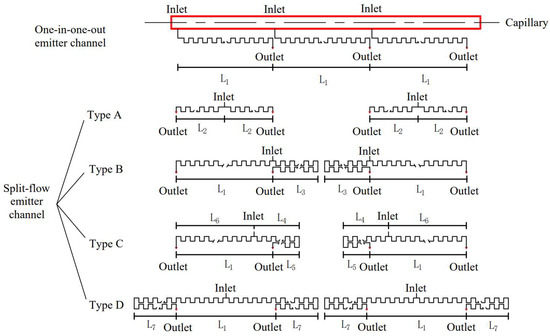 Schematic diagram of the channel layout of one-in-one-out and split-flow emitters. Notes: Type A–D, four channel layouts for split-flow emitter; L1, outlet spacing (or one-in-one-out emitter channel length); L2, single-sided channel length of the Type A emitter; L3, single-side channel turn-back length of the Type B emitter; L4, single-side channel not turn-back length of the Type C emitter; L5, single-side channel turn-back length of the Type C emitter; L6, single-side channel length of the Type C emitter; L7, single-side channel turn-back length of the Type D emitter.