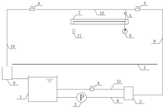 Test system. Notes: 1, water tank; 2, water pump; 3, surge tank; 4, pressure regulating valve; 5, test bench; 6, precision pressure gauge; 7, test model; 8, supply water pipeline; 9, collecting tank; 10, return water pipeline; 11, measuring cylinder.
