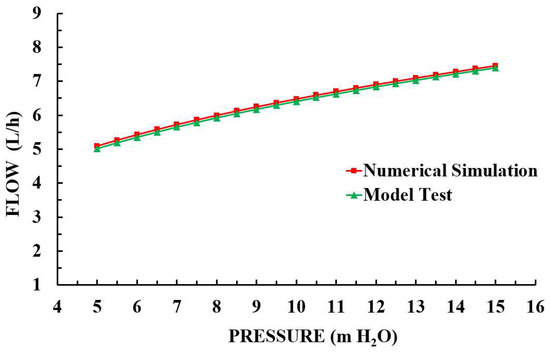 The physical quantities tested in the experiment were the inlet pressure and outlet flow of the emitter. The inlet pressure was measured by a 0.25-grade pressure gauge with a maximum range of 0.16 MPa and an accuracy of 0.0005 MPa, and the flow was measured with 200 and 500 mL measured cylinders according to the outflow. The test was in accordance with the test specification of Micro-Emitter Irrigator-Dripper (SL/T67.1-94). The flow was measured twice under each inlet pressure, the time taken for each flow measurement was no less than 2 min, the difference between the two measured flows was no more than 2%, and the average value of 2 times was taken as the discharge flow (L/h) of the emitter.