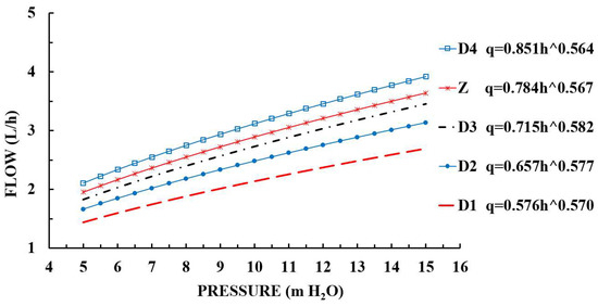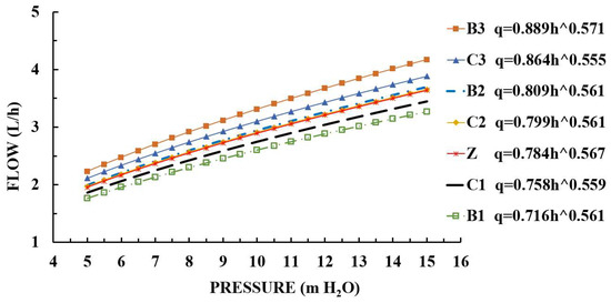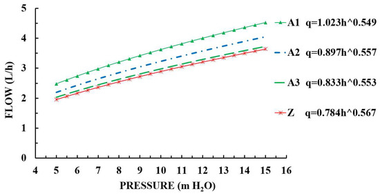where k is the flow coefficient, x is the flow state index, q is the flow rate of the emitter (L/h), and h is the inlet pressure of the emitter (m H2O). The hydraulic performance of the emitter, that is, the sensitivity of the flow to the working pressure, can be expressed by the slope of the pressure–flow relationship curve.