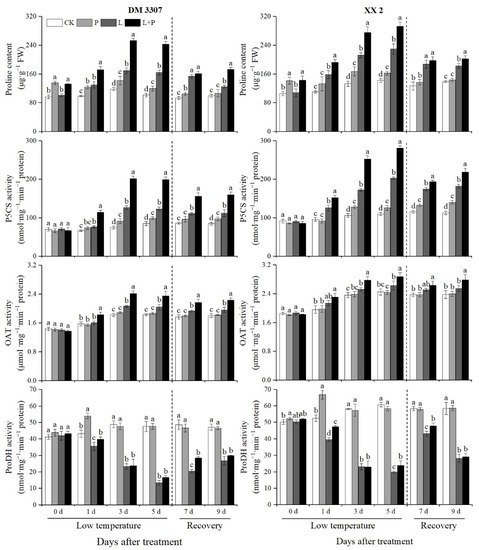 It can be seen from Figure 1 that with the extension of low temperature stress time, the proline content, P5CS activity and OAT activity in the DM 3307 and XX 2 embryos gradually increased, while the ProDH activity showed a gradual decreasing trend and reached the extreme value on the fifth day of treatment. On the fifth day of treatment, compared with the normal temperature control treatment, the low temperature stress treatment significantly increased the proline content, P5CS activity and OAT activity of the two maize varieties, but inhibited the ProDH activity. Under the condition of low temperature stress, the proline soaking treatment further promoted the proline content, P5CS activity and OAT activity of the two maize varieties. The decrease in ProDH activity was alleviated, but the change was not significant and this promoting effect was more significant in the DM 3307. On the fifth day of low temperature stress, compared with the low temperature stress treatment, the proline content, P5CS activity, OAT activity and ProDH activity in the DM 3307 embryos increased by 48.33%, 62.13%, 14.90% and 23.94%, respectively; the proline content, P5CS activity, OAT activity and ProDH activity in the XX 2 embryos increased by 27.63%, 38.35%, 9.38% and 19.87%, respectively. At the same time, after the maize embryo was relieved of low temperature stress, the proline content, P5CS activity and OAT activity of the two maize varieties decreased, while the ProDH activity increased, and the promoting effect of the proline soaking was still obvious (Figure 1).