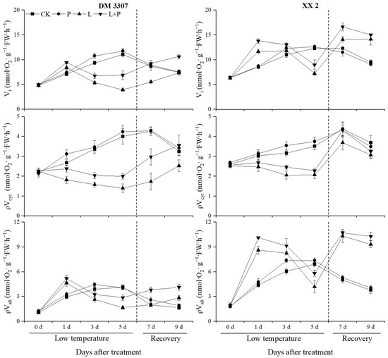 As can be seen from Figure 2, the Vt and ρValt increased rapidly in the early stage of low temperature stress (day 1). With the extension of the low temperature stress time, the two indexes continued to decline and recovered after restoring normal temperature. Compared with the control, the Vt and ρValt of the DM 3307 increased by 18.18% and 56.42%, respectively, on the first day and decreased by 64.33% and 59.70%, respectively, on the fifth day; the Vt and ρValt of the XX 2 increased by 35.98% and 95.6%, respectively, on the first day, and decreased by 41.34% and 39.58%, respectively, on the fifth day.