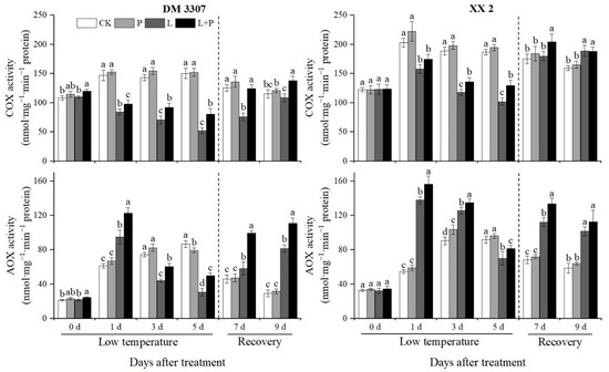 Effect of exogenous proline on the activities of COX and AOX in embryos of maize under low temperature stress. Different letters within a column indicate significant differences at p < 0.05.