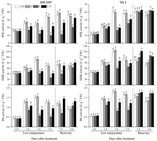 Effect of exogenous proline on the activities of PFK, HXK and PK in embryos of maize under low temperature stress. Different letters within a column indicate significant differences at p < 0.05.