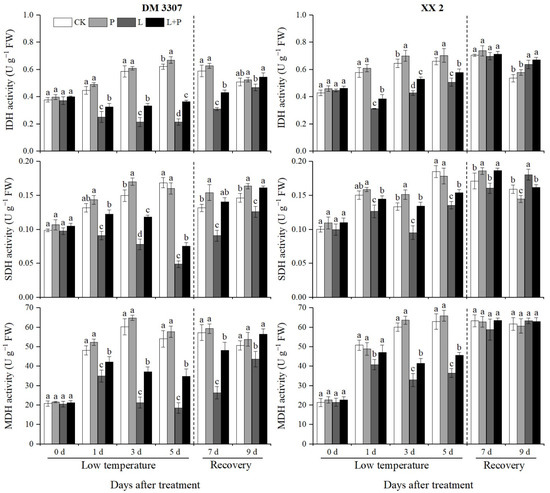 Effect of exogenous proline on the activities of IDH, SDH and MDH in embryos of maize under low temperature stress. Different letters within a column indicate significant differences at p < 0.05.