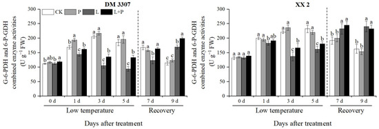 The key metabolic pathway of seed germination is the smooth progress of the pentose phosphate pathway (PPP). G-6-PDH and 6-P-GDH are two key enzymes in the pentose phosphate pathway. It can be seen from Figure 6 that during low temperature, the activities of the G-6-PDH and 6-P-GDH combined enzymes in the maize embryos of the two varieties first increased and then decreased, and then recovered after the stress was relieved. Compared with the control, the activities of the G-6-PDH and 6-P-GDH combined enzymes in the embryos of the DM 3307 treated with low temperature reached the peak on the fifth day, which decreased by 49.11%; the activities of the G-6-PDH and 6-P-GDH combined enzymes in the XX 2 embryos reached the peak on the third day and decreased by 37.98%. Under low temperature stress, the application of exogenous proline alleviated the decrease in G-6-PDH and 6-P-GDH combined enzyme activities of the seed embryos caused by low temperature to a certain extent. After the stress was relieved, the G-6-PDH and 6-P-GDH combined enzyme activities of the seed embryos recovered faster, and the G-6-PDH and 6-P-GDH combined enzyme activities of the DM 3307 embryos were alleviated more significantly. Compared with the low temperature treatment, the combined enzyme activities of the G-6-PDH and 6-P-GDH of the DM 3307 and XX 2 embryos treated by proline soaking under low temperature stress, increased by 41.96% and 11.63%, respectively, on the fifth day, and increased by 32.10% and 5.51%, respectively, on the second day of recovery (Figure 6).