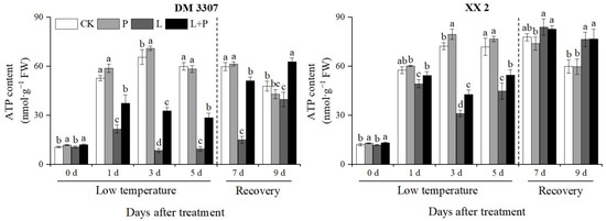 During the low temperature period, the ATP content in the embryos of the two varieties of maize first increased and then decreased, and then recovered after the stress was relieved, as shown in Figure 7. Compared with the control, the ATP content of the DM 3307 and XX 2 embryos reached the peak on the third day, which decreased by 86.94% and 56.79%, respectively; however, the application of exogenous proline under low temperature stress alleviated the decrease in ATP content and activity of the seed embryos caused by low temperature to a certain extent. After the stress was relieved, the ATP content and activity of the seed embryos recovered rapidly, and the ATP content of the DM 3307 embryos increased significantly. Compared with low temperature treatment, the ATP content and activity of the DM 3307 and XX 2 embryos were increased by 194.51% and 37.19%, respectively, on the fifth day and 236.45% and 0.28%, respectively, on the fourth day of recovery (Figure 7).