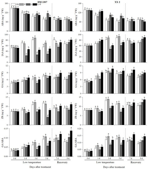 It can be seen from Figure 8 that on the third and fifth days of treatment, the low temperature stress treatment significantly increased the ABA content of the seed embryos of the two maize varieties, and proline inhibited the ABA content of the seed embryos of the two maize varieties under the normal temperature and low temperature treatments after seed soaking. The ow temperature stress treatment significantly inhibited the IAA content of DM 3307 and XX 2 embryos, and exogenous proline significantly increased the IAA content of all kinds of embryos of the two products, which was the most significant on the third and fifth days of low temperature. The IAA content of the DM 3307 increased by 90.04% and 61.79%, respectively; the IAA content of the XX 2 increased by 26.15% and 17.52%, respectively. It can be seen that the IAA content of the low temperature sensitive maize varieties was more sensitive to low temperature. Similarly, the contents of GA and ZR in the embryos of the two maize varieties increased first and then decreased with the extension of the low temperature stress time and reached the peak on the third day of treatment. Compared with the normal treatment, the low temperature treatment significantly inhibited the contents of GA and ZR in the embryos of the two varieties. On the third day of the low temperature treatment, compared with the simple low temperature treatment, the GA and ZR contents of the DM 3307 embryos increased by 34.01% and 14.98%, respectively the GA and ZR contents of the XX 2 embryos increased by 18.18% and 14.65%, respectively. At the same time, the low temperature stress treatment also significantly inhibited the GA/ABA ratio. On the fifth day of the low temperature treatment, the GA/ABA ratio of the DM 3307 and XX 2 embryos decreased by 44.69% and 39.94%, respectively. Seed soaking with proline could significantly increase the GA/ABA ratio in the embryo of the two maize varieties. After relieving the low temperature stress of the maize embryos, the contents of IAA, GA and ZR and the ratio of GA/ABA in the DM 3307 and XX 2 embryos increased in varying degrees, while the content of ABA decreased, and the exogenous proline treatment could also promote the accumulation of IAA, GA and ZR contents in embryos (Figure 8).