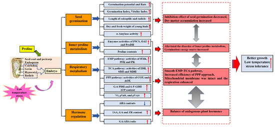 Under low temperature, plants will accumulate a series of osmoregulatory substances to resist the effects of stress, especially proline. Under abiotic stress, proline can account for up to 80% of the cellular amino acid pool [23], while proline accumulation can be detected in various tissues undergoing rapid cell division and elongation [24], for example, proline accumulated in immature broad bean seeds and the hypothesis was put forward that proline may be important for the development of reproductive organs [25]. Genes encoding the key enzymes of proline metabolism have been successively found in Arabidopsis, tomato, alfalfa and rice, which are expressed during seed development [26,27]. The expression of antisense AtP5CS1, for example, led to the delay of the radicle in the process of Arabidopsis seed germination, which proved the evidence of proline synthesis in seed germination [28]. Exogenous proline can promote cell division and alleviate abnormal embryonic development by up-regulating the expression of the cyclin CYCB1:1 gene [29,30]. The homozygous grains of the mutant not only showed the collapsed form of a powdery endosperm, but also showed lethality at the two-leaf stage. The exogenous addition of proline can restore its normal development, therefore it is named proline responding 1(pro1). The Pro1 gene encodes P5CS2 through positional cloning and the functional identification of the maize Pro1 gene [31]. The loss of P5CS2 function in the maize mutant reduces the synthesis of proline and the lack of proline causes the accumulation of uncharged tRNApro AGG in cells, resulting in a general reduction in protein synthesis and proline deficiency affecting the accumulation of plant protein [32]. These studies point out that proline plays an important regulatory role in protein synthesis and cell cycle transformation in higher plants. Exogenous proline can improve the germination rate of cotton, pea and wheat seeds, reduce the germination time and promote the growth of seedlings under osmotic stress [33]. Meanwhile, exogenous proline has promoted wheat seed germination, root growth and seedling development under cadmium stress [34].