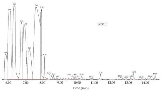 The headspace solid-phase microextraction (HS-SPME) was used to identify volatile organic compounds. Fibers coated with polydimethylsiloxane of 100 µm were used. The fibers were conditioned before use by heating them in the chromatographic injector port, performing a complete execution on the system. A sample of 8 µL of essential oil was deposited in a 5 mL headspace vial and was enriched for 4 min on an SPME fiber. The analysis was performed on an Agilent HP 6890 with a 5973 GCMS System (Wilmington, DE, USA). The compounds were separated into an Agilent J&W HP-5ms capillary column (Wilmington, DE, USA). The enriched fiber was placed in the GC injector. The oven temperature was set at 40 to 250 °C with increasing intervals of 10 °C/min. The execution was completed in 10 min. The relative percentages of essential oil compounds were obtained using helium as a carrier gas with a flow rate of 1 mL/min. The compounds were identified by the GC retention time and the mass spectrum library of the National Institute of Standards and Technology (NIST) 02; also, the spectra were compared with those stored in the NIST 14 library.