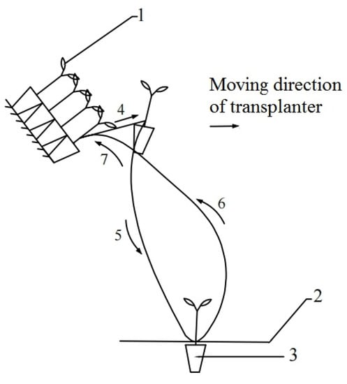 - Zhang, Z.; Zhang, N.; Lv, Q.; Han, C.; Xu, H.; Li, H.; Bai, Z. Design and Research on the Automatic Transplanting Machine of the Top Pinch Combined Type Plug Seedling. Xinjiang Agric. Mech. 2016, 6, 16–18, 45. [Google Scholar]