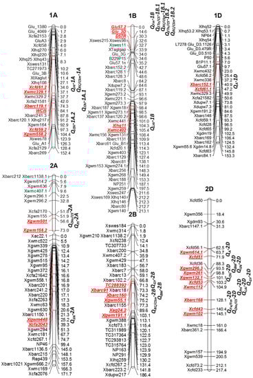 The descriptive statistics, analysis of variance, and significance determination were conducted by using SPSS 13.0 for Windows. The mean values of the investigated parameters from each trial were used for the QTL analysis following the composite interval mapping (CIM) method with Windows QTL Cartographer 2.5 [68]. Model 6 was obtained using forward and backward regression on a window size of 10 cM, and the walk speed was 2 cM. The threshold of likelihood of odd (LOD) scores were calculated for each trait according to 1000 random permutations at p < 0.05 [69,70]. A significant QTL was declared when its LOD peak score was above the threshold values. The additive effects and R2 value, the percentage of the phenotypic variance explained by the QTL, of each QTL were obtained directly from the output of this software. The linkage map consisted of 523 simple sequenced repeats (SSRs), 18 expressed sequence tag-SSRs (EST-SSRs), and 14 Glu loci, which was previously reported by Xu et al. (2014) [56].