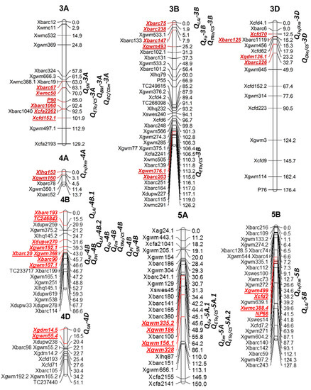 In addition, the QTL was also found to co-locate or nearly link with photosynthesis and/or GY-related traits. For instance, an LAI QTL, located between Xgwm273.3 and Xbarc61 on 1B, was co-located with the QTL for Chl [37], tiller number [48], TGW [52], and GY [47,49,53]. Additionally, an SN QTL on 2A flanked by Xgwm630 and Xwmc181 was linked with QChl a + b.igdb-2A, QChl a.igdb-2A.1, and QChl a.igdb-2A.1 during senescence [38], qFv/FmN-2A under non-stress, qFmH-2A and qFv/FmH-2A under high light stress [39], and QFv/Fm.csdh-2A [37]. Additionally, it was consistent with the QTL for the SN per plant [56] and TGW [47]. In addition, a Chl QTL QChl-1A.1 flanked by Xbarc119.1 and WCI5 on 1A was consistent with the QTL for Fo and TRo/CS [37], Chl and Fm under high-light stress [39], Chl and Car in medium-light-grown wheat seedlings [40], and grain weight per spike [56]. QCL2 on 1B between Glu57.2 and Glu_3D detected for Fm, RC/CSm, and ETo/CS was nearly linked with a Chl QTL [37], indicating that it may regulate the maximal fluorescence level, electron transport flux, and density of reaction centers, as well as Chl.