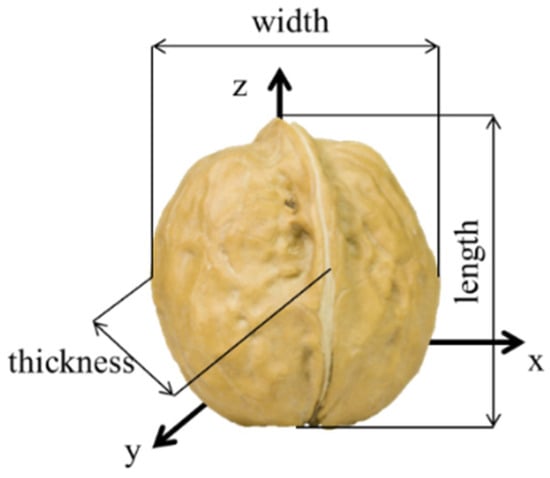 The walnuts that were used in this study were Wen185 varieties that are widely planted in Xinjiang Province, which is the main walnut-producing area in China. The walnut was ellipsoidal in shape with an average length of 4.7 cm, thickness of 3.7 cm, and width of 3.7 cm. The length, width and thickness are shown in Figure 1. A total of 100 walnuts were randomly selected and tested, and the average single walnut weight was 15.8 g, the average shell thickness was 0.8 mm, and the kernel yield of walnut was 65.9% by manual shelling. The initial average moisture content of the walnuts was determined to be 16.95% (w.b.), following the standard for oilseeds [20].