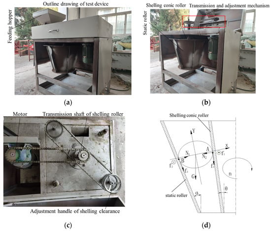 The conic roller-shelling device is mainly composed of a shelling conic roller and a static roller, as presented in Figure 2a. Figure 2b,c show the shelling prototype. The walnuts enter the clearance between the shelling conic roller and the static roller, driven by the rotation of the shelling conic roller, and are rubbed and squeezed by the static and shelling conic roller to break the shell and release the nut shelling. In order to meet the requirements of the study, the required speed of the shelling conic roller can be obtained by the adjustment of a frequency converter, and the gap between the shelling conic roller and the static roller can be adjusted through the transmission and adjustment mechanism as showed in the red rectangle in Figure 2b.