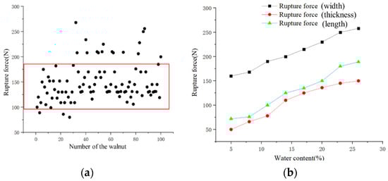 The mechanical test results of the walnuts with storage moisture content (16.95%) are shown in Figure 3. It can be seen from the figure that the distribution range of the rupture force under normal moisture content is relatively wide, from 80 N to 268 N, but is mainly distributed from 100 N–175 N as shown in the red rectangle area in Figure 4a. The variation in the rupture force with moisture content is shown in Figure 4b.