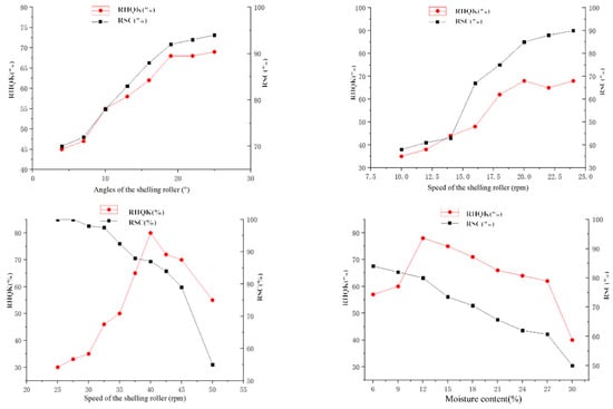The effects of the shelling conic roller angles, speeds of the shelling conic roller, clearance between the shelling conic roller and static roller, and the moisture content of the walnuts on RHQK and RSC are illustrated in Figure 5.