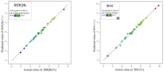 The F-value of the RHQK model was 176.41, implying that the model is significant. There is only a 0.01% chance that an F-value this large could occur because of noise. The lack-of-fit F-value of 0.29 implied that the lack of fit was not significant relative to the pure error. A non-significant lack-of-fit value was good, because we want the model to fit. The lack of fit indicates that the model can be used to predict RHQK. Similarly, the prediction accuracy of the RSC model can be determined. Figure 6 also indicates that the model can accurately predict RHQK and RSC.