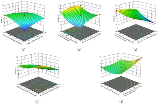 (a) Interactions of speeds of the shelling roller and angles of the shelling roller on RHQK, (b) interactions of clearance between shelling roller and static roller and speed of the shelling roller on RHQK, (c) interactions of clearance between shelling roller and speed of the shelling roller on RSC, (d) interactions of water content of walnuts and speeds of the shelling roller on RSC, (e) interactions of water content of walnuts and clearance between shelling roller and static roller on RSC.