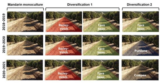 - Diversification 2 (D2). Mandarin with intercrop rotation 2 and regulated deficit irrigation. In the alleyways, fava bean (Vicia faba L.) was grown from September 2018 to January 2019, purslane (Portulaca oleracea) from May to July 2019, and cowpea (Vigna unguiculata) from June to September 2020.
