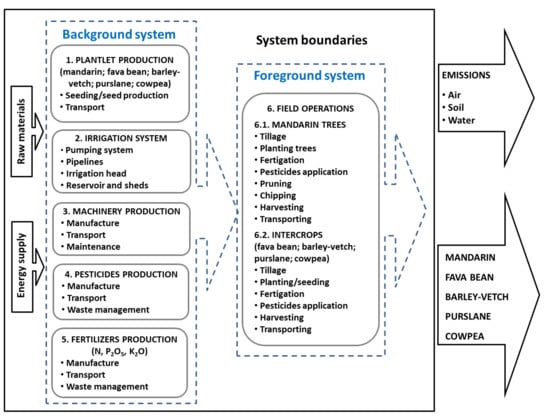 All the processes of the production chain of mandarin fruit and intercrops from the extraction of raw materials to the farm gate are within the system boundaries, as shown in Figure 2. The background system comprises the processes that take place before the farm stage whilst all the field operations are included in the foreground system (Table S3).
