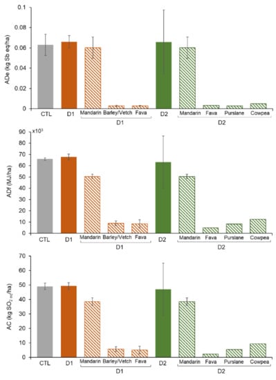 The values of the environmental impacts separated by subsystems were also analyzed (Figure S2). For all categories and for all systems studied (CTL, D1, D2), the field work, the production of fertilizers, and the irrigation subsystem dominated (more than 80% together) the footprint in the ADf, AC, EU, and GW categories. A higher weight of the irrigation subsystem in ADf, AC, and GW was observed, which was mainly associated with the fact that the electricity mix in Spain still relies largely on the use of fossil fuels. The production of fertilizers was the main contributor (34%) to the EU impact in CTL and D2, while in D1, it was the field work (31%) because of the higher diesel fuel consumption used in tillage practices for the two annual crops (barley-vetch and fava bean).