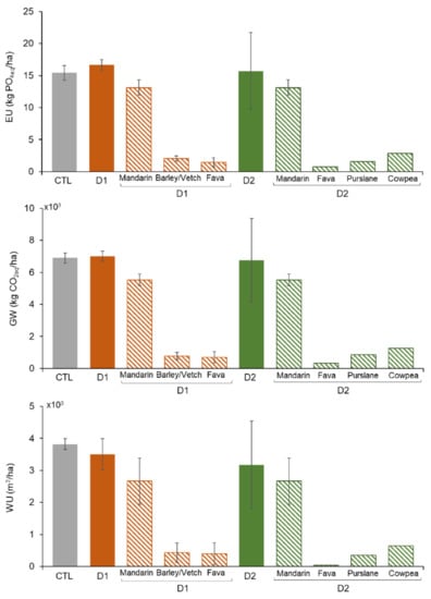 - No significant differences between the CTL and diversifications D1 and D2 were observed in any of the five mid-point impact categories analyzed (Table S7). Only water use was observed to gradually decrease from the CTL to D1 to D2 (3820, 3351, and 3007 m3/ha, respectively), although the differences were not statistically significant, due to the high variability in the data collected in D2. Note that, in D2, the higher variability is related to fact that there was a different intercrop each year, unlike in the CTL and D1.