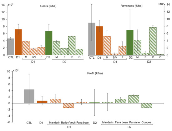 Mean value and standard deviation of the annual costs, revenues, and profit per unit of area. The bars with solid patterns show the total values per hectare of cultivated area for mandarin (CTL), diversification D1 (D1), and diversification D2 (D2). The bars with diagonal line patterns correspond to the disaggregated values for each crop in D1 and D2.