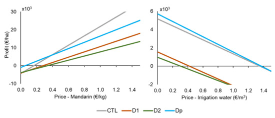 In the study area, important fluctuations have been reported in the financial profitability of citrus orchards driven by changes in the market price of the fruit and the price of irrigation water [62,63]. Therefore, a sensitivity analysis was carried out to assess how the variation in the price of mandarin and irrigation water could impact profitability, and whether or not the crop diversifications enabled the market risks for farmers to be reduced. Apart from exploring D1 and D2, an alternative diversification was proposed (Dp) with purslane and fava bean as intercrops, as they were observed to be the most profitable intercrops during the trial.