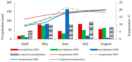 The weather conditions varied over the years of the study (Figure 1) and affected the assessed features and parameters of the Melilotus albus fodder. In April, rainfall was well below the multiyear average. During the years 2018 and 2019, low rainfall was also recorded in June. On the other hand, in June 2020, heavy rains were observed, while July and August were dry months. The temperature conditions varied in April, May, and June. In contrast, temperatures in July were close to the multiyear average. August was relatively warm.