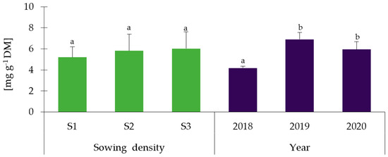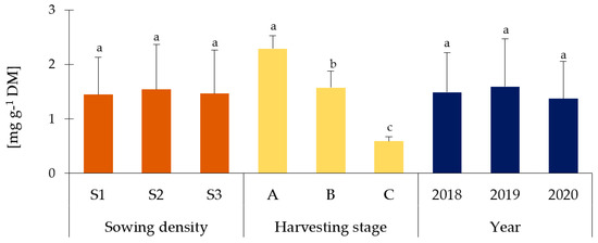 No interaction was found between harvesting stage and sowing density, as well as sowing density and years, both for micro and macroelements (Tables S1b and S2b). Statistically significant differences were found between potassium, iron, and copper content, but these were caused by the main factor, which was the harvesting stages (Table S1b). Similarly, the significant differences in phosphorus, iron, and molybdenum content were due to the influence of one factor, a year (Table S2b). Statistically significant effects of both harvesting stages and years were found for potassium, phosphorus, iron, zinc, and magnesium contents (Table S3b). For the other elements, no interaction was found, even if the main factors had a significant effect. It should be noted that the variation in mineral composition between years may be influenced by the mineral composition of the soil, which varied between years.