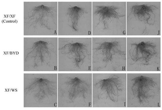 Roots of control (XF/XF) and grafted (XF/WS, XF/BYD) peppers before inoculation (A–C), and 5 d (D–F), 10 d (G–I), and 15 d after inoculation (J–L).