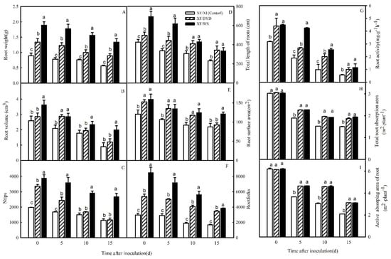 Roots harvested at 0, 5, 10, and 15 d after inoculation were measured with a root analyzer (J181A, Shanghai, China), and the resulting data were analyzed using WinRHIZO software (Regent Instruments, Quebec City, QC, Canada) to calculate the root length, surface area, volume, fork number, and tip number. An electronic balance was used to measured root mass, and triphenyltetrazolium chloride (TTC) staining was used to assess root activity []. The methylene blue techniques described by Li et al. [] were used to measure the total root absorbing area and active root absorbing area.