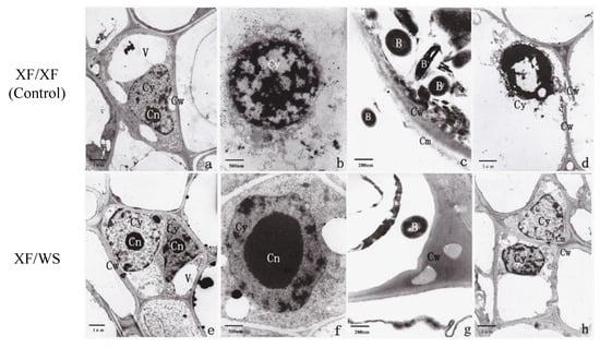 Root cellular ultrastructure of control (XF/XF) and grafted (XF/WS) peppers: uninfected XF/XF (a), XF/XF infected by R. solanacearum for 5 d (b–d), uninfected XF/WS (e), XF/WS infected by R. solanacearum for 5 d (f–h). B, bacteria. Cm, cell membrane. Cn, cell nucleus. Cw, cell wall, Cy, cytoplasm. V, vacuole.