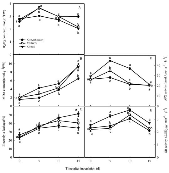 R. solanacearum infection was associated with markedly higher MDA contents in all plants (Figure 4B). However, the MDA content was lower in the XF/BYD and XF/WS plants than in the controls (p < 0.05). These data corroborate the earlier finding that grafting alleviates membrane injury to root cells caused by R. solanacearum. R. solanacearum also caused significant increases in EL in all plants (p < 0.05) (Figure 4C), and the EL was higher in the control plants than in the grafted plants at all timepoints. Fifteen days after inoculation, the EL of the XF/BYD and XF/WS plants was 21.2% and 32.8% lower, respectively, than that of the control plants. Finally, APX and GR activities increased during the first 5 or 10 d after inoculation but decreased thereafter. APX and GR activities were significantly higher in the grafted plants than in the controls (p < 0.05).