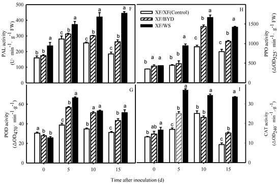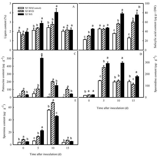 After inoculation, grafting led to a higher production of secondary metabolites (SA, lignin, and PAs) in grafted pepper plants relative to the control plants (Figure 5). Grafted pepper roots showed significantly higher SA content after inoculation, and this increase was much greater than the more moderate increase found in the controls (p < 0.05) (Figure 5B). Lignin content also increased gradually in response to inoculation and then decreased over time, and this increase was significantly greater in the controls than in the XF/WS and XF/BYD plants (p < 0.05) (Figure 5A). However, at 10 d post-inoculation, the lignin content of XF/WS had increased by 115.7% and that of XF/BYD had increased by 75.0%. By contrast, the lignin content of the control plants had increased by only 31.6%. Prior to inoculation, the putrescine content was significantly higher in XF/BYD and XF/WS roots (p < 0.05) than in controls, but spermidine content did not differ among any treatments (Figure 5C,D). The spermine content was higher in the roots of XF/BYD (p < 0.05) than in the control roots (Figure 5E), but there was no difference in root spermine content between the XF/WS and control plants. Following inoculation, the contents of all three PAs initially increased and then declined; nonetheless, each reached higher levels in the XF/WS roots than in the control roots (p < 0.05).